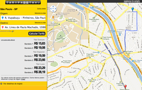 A taxi from Avenida Paulista to Rua Cardoso de Almeida (Council) will cost as little as R$25 or as much as R$40, depending on traffic. The cheaper, white Taxi Commun (ordinary taxi) charges from R$30 to R$45 for the trip from Council to Jardins. In São Paulo, taxis are divided into three categories: regular, special, and radio-taxi. Special and radio-taxis are more expensive, but you contact them by phone. In general, fare 1 (regular) applies from 6 am to 10 pm whereas fare 2 applies the rest of the time.